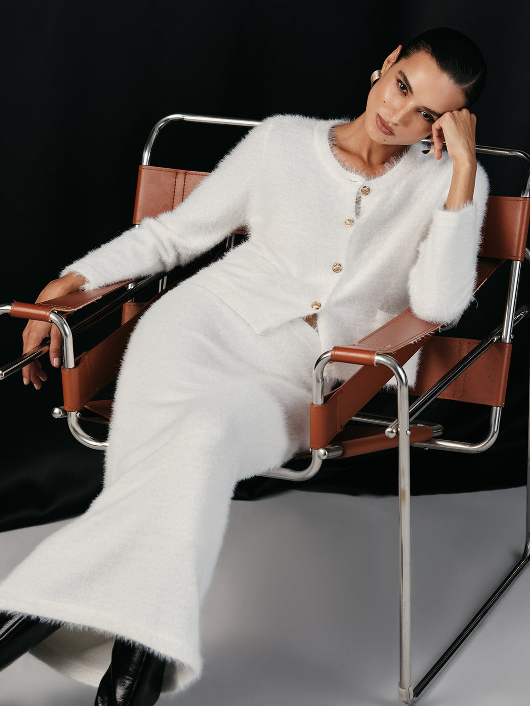 V Yaka Düğmeleri Önde Dekolte Örgü Hırka ve Maksı Etek Takımı