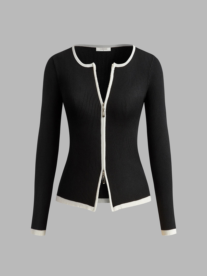 Kontrast Dikişli İki Fermuarlı Triko Üst