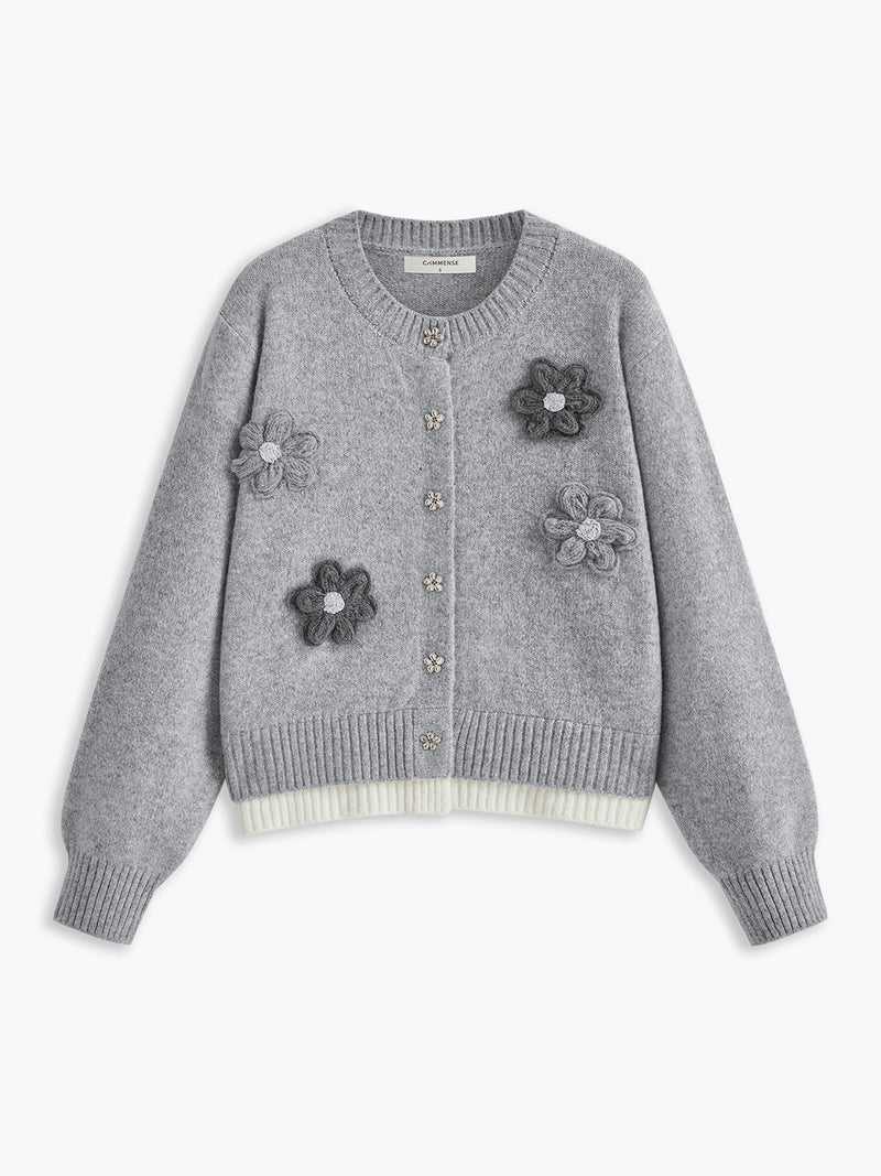 3D Çiçek Kontrast Detaylı Kadife Hırka
