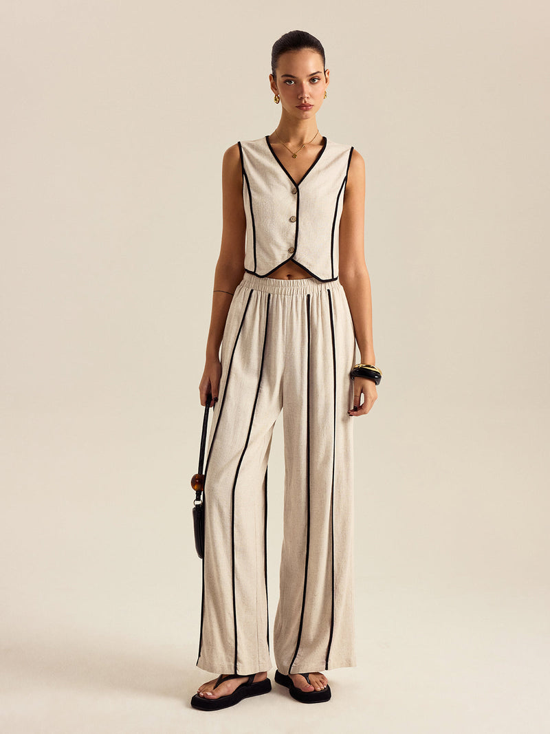 desenli keten ve pamuklu pantolon takımı, elastik beli
